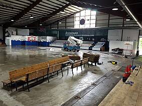 Wie man auf den Bildern unten sieht ist die Fläche noch nicht mal vollständig getrocknet, trotzdem haben es rund 30 unermüdliche Helfer in kürzester Zeit geschafft die Bande, Netze, Zeitnehmer-Box, Spielerbänke, etc. abzubauen und das Icehouse einer großen Lagerhalle ähneln zu lassen. Der besondere Dank gilt dabei neben Fritz Haaf (dem Vorstand des ECE) vor allem der 1. Mannschaft der Eisbären sowie den Rhein-Neckar Gladiators. Denn die Gladiators haben sich dabei hauptsächlich dem Bandenabbau angenommen, damit Sie diese im Gegenzug unentgeltlich übernehmen und auf Ihrem eigenen Hockey-Platz in Ketsch wieder aufbauen können. Da ursprünglich als einzige Alternative die Verwertung der einzelnen Banden-Bestandteile im Raum stand, haben wir mit dieser Option für alle die bessere Lösung gefunden! Denn so wie die SAP-Arena den ECE mit der Bande unterstützt hat, konnte dies nun der ECE für die Gladiators tun.