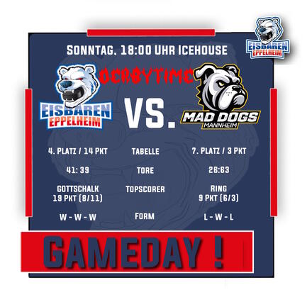 Die Saison neigt sich langsam dem Ende, das kommende Heimspiel ist bereits das letzte Auflaufen im Icehouse. Doch der Spielplan sieht mit dem Derby gegen Mannheim pünktlich zur Fastnachszeit ein echtes Highlight zum Abschluß. Das Jahr startete mit dem Derby in Mannheim - welches den Eisbären den ersten Saisonssieg einbrachte. Seither konnten die Eisbären ihre Form stetig steigern, mit einer aktuell 3 Spiele andauernden Siegesserie 13 Punkte sammeln, durch die man bis auf Rang vier klettern konnte. Mannheim hingegen musste sich mit einem Sieg begnügen, so dass die Tabellennachbarn des Hinspiels nun 3 Plätze und 11 Punkte trennen. Doch das Hinspiel hat bereits gezeigt, dass Mannheim gegen die Eisbären extra motiviert ist, am Ende reichte ein knappes 6:4 zum ersten Saisonsieg. Da die 1. Mannschaft der Mad Dogs spielfrei ist, erwarten die Eisbären einen starken Hunde-Kader in Eppelheim, der es den Eisbären schwerstmöglich machen wird, das Heimspieljahr siegreich zu beenden.